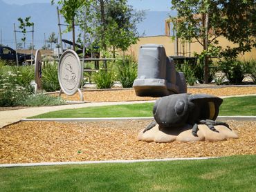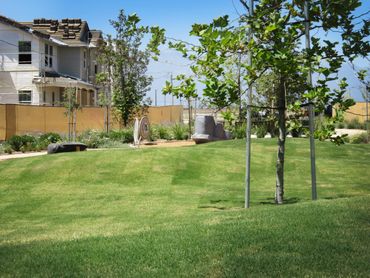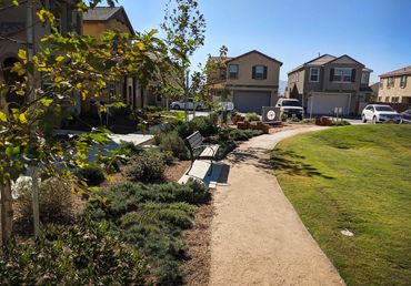 The paseo park site at Willowmore features mostly native trees and shrub species that provides added wonder and benefits of butterflies, lady bugs, and hummingbirds. The park design includes a mounded open play lawn area, surrounded by a community picnic space, and an informal meandering decomposed granite trail
